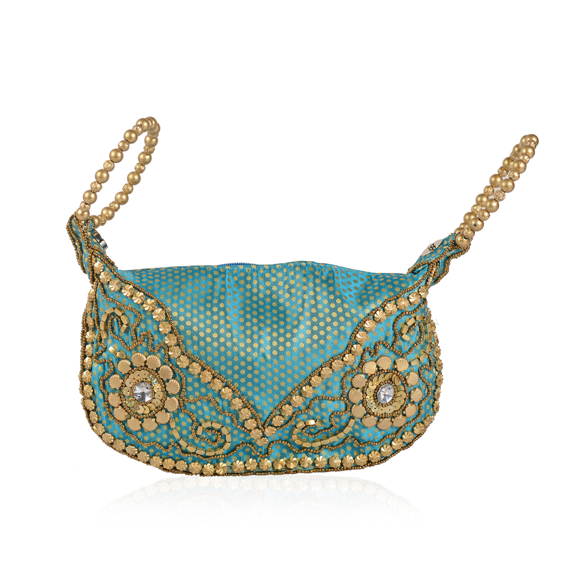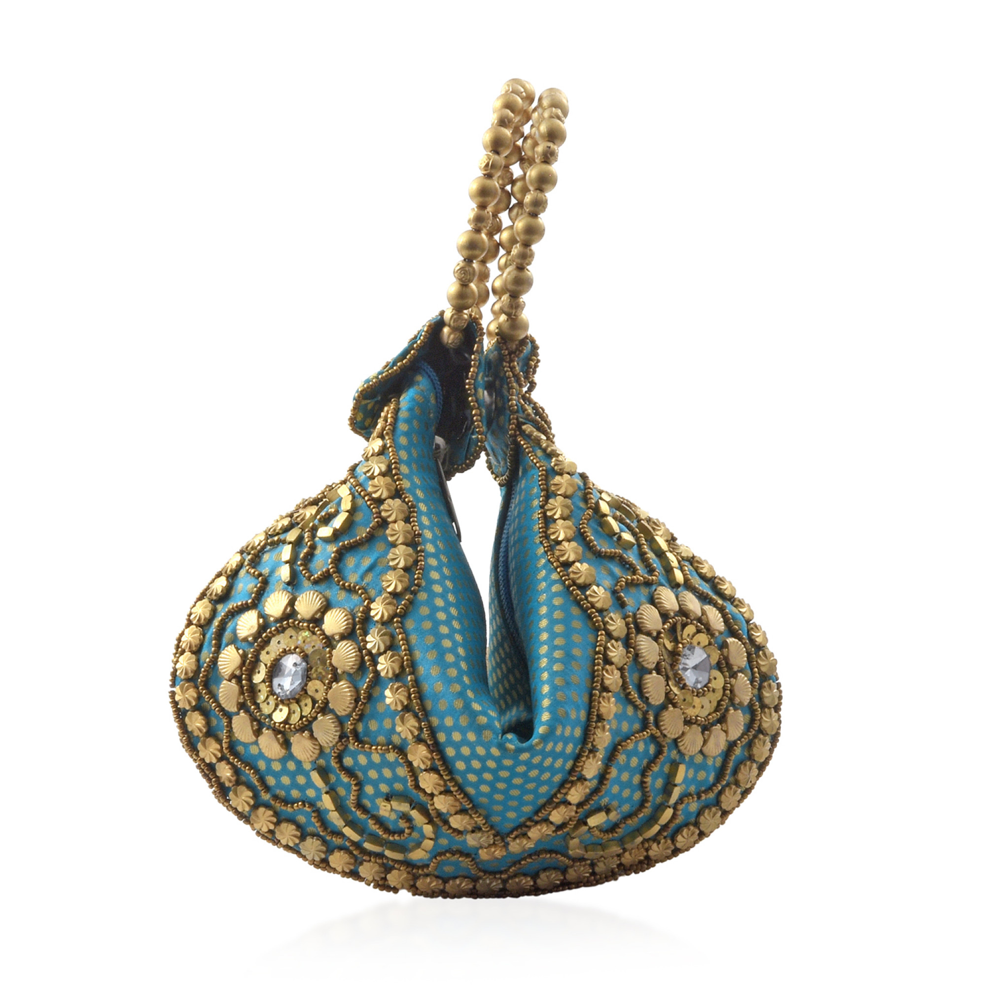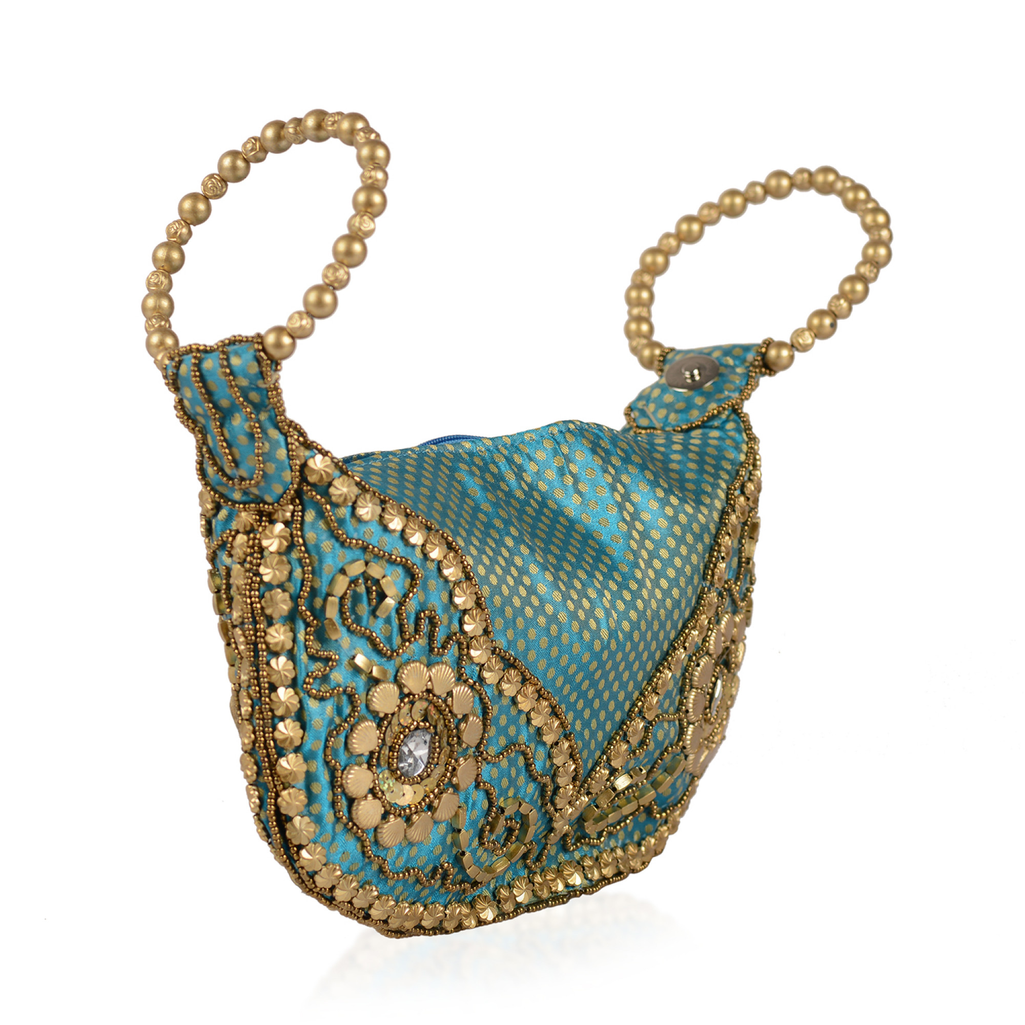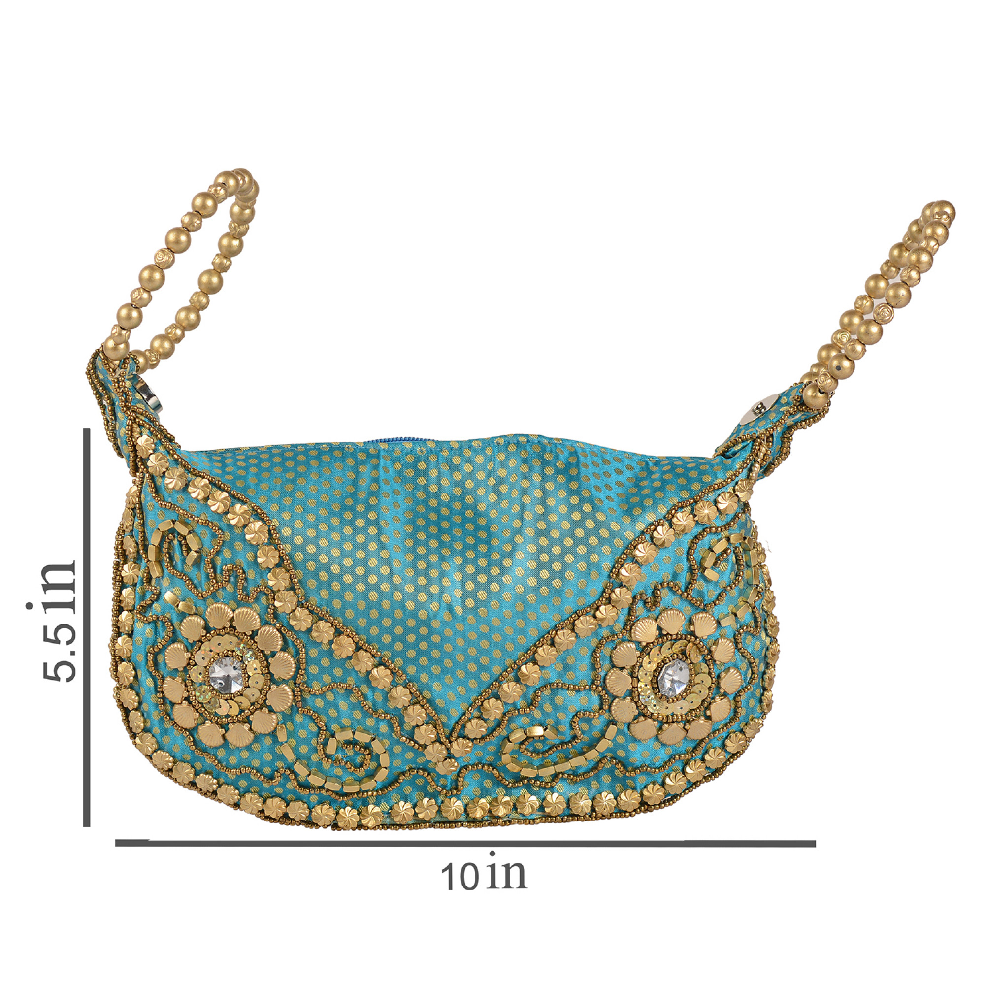Handcrafted Turquoise Satin Pearl Acrylic Beads Potli Bag